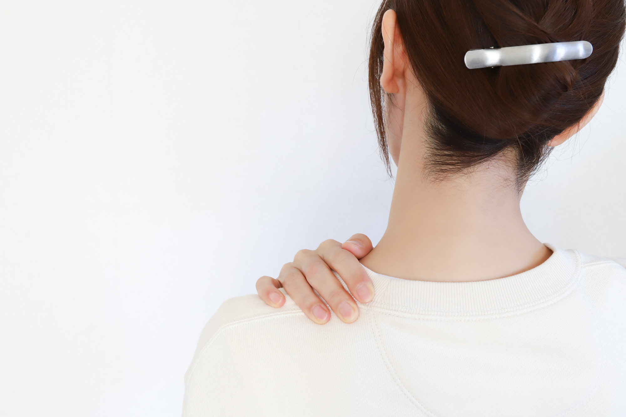 首から背中にかけての筋肉が緊張し、重だるさや痛みが続く状態です。放置すると悪化しやすく、姿勢や骨格のゆがみなど、全身のバランスを整えることが改善のポイントになります。